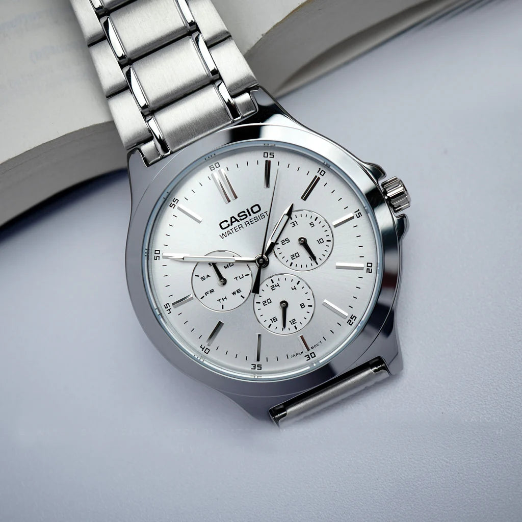 Brand, Seller, or Collection Name Casio Model number MTP-V300D-7AUDF/MTP-V300HD-7AUIF Part Number A1174 Model Year Item Shape Round Dial window material type Mineral Display Type Analog Clasp Push Button Deployment Clasp Case material Stainless Steel Case diameter 41.5 millimeters Case Thickness 11 millimeters Band Material Stainless Steel Band width 22 millimeters Band Color Silver Dial color White Calendar date and day of week indicator Special features Chronograph Item weight 259 g Movement Quartz Water resistant depth 3 Meters Warranty If this product is sold by Amazon, please review the manufacturer’s website for warranty information. If this product is sold by another party, please contact the seller directly for warranty information for this product. You may also be able to find warranty information on the manufacturer’s website.